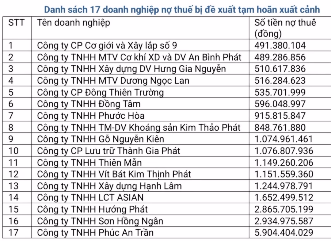 cơ quan thuế tỉnh Đồng Nai đã thực hiện biện pháp tạm hoãn xuất cảnh đối với người đại diện theo pháp luật của 17 doanh nghiệp đang nợ thuế. Số tiền nợ thuế của các doanh nghiệp này lên tới khoảng 23,96 tỷ đồng. Đây là một phần trong chuỗi biện pháp cưỡng chế thuế đối với doanh nghiệp có hành vi chây ì nộp ngân sách, ảnh hưởng đến nguồn thu và kỷ cương tài chính công.