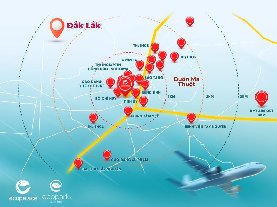 Ecopalace tọa lạc tại khu vực trung tâm hành chính mới đang được đầu tư đồng bộ về hạ tầng. Với vị trí chiến lược, kết nối nhanh đến bệnh viện, sân bay, trường học và các trung tâm tài chính – hành chính – thương mại của Đắk Lắk, shophouse Ecopalace mang đến cơ hội sở hữu vị trí ‘kim cương’ – nơi sinh lời dài hạn và giữ giá vững chắc cho thế hệ sau.