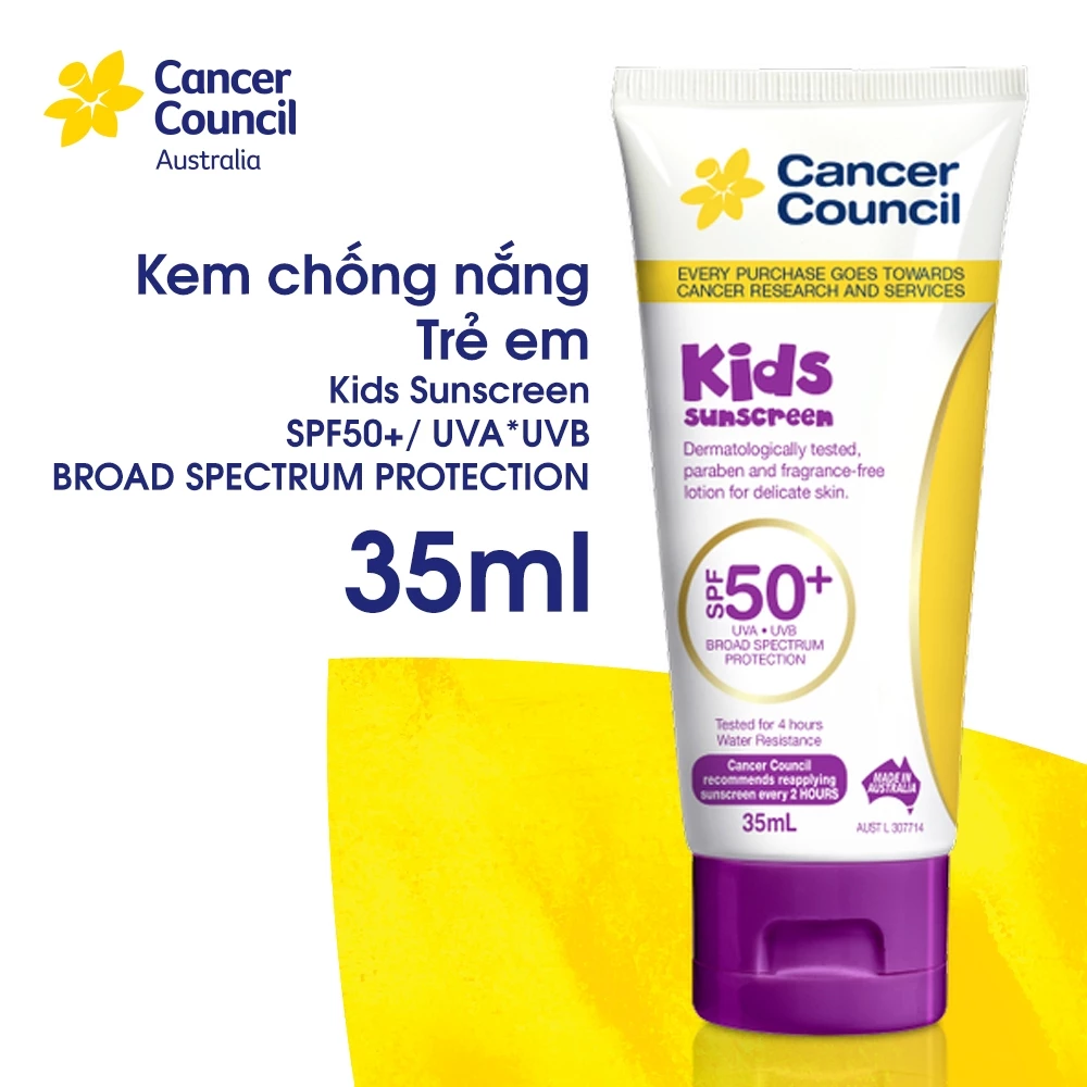 - Kem chống nắng Cancer Council Kids SPF 50+/PA++++ 35ml: Chỉ số SPF 50+, PA++++, thành phần tự nhiên, giá 109.000 đồng