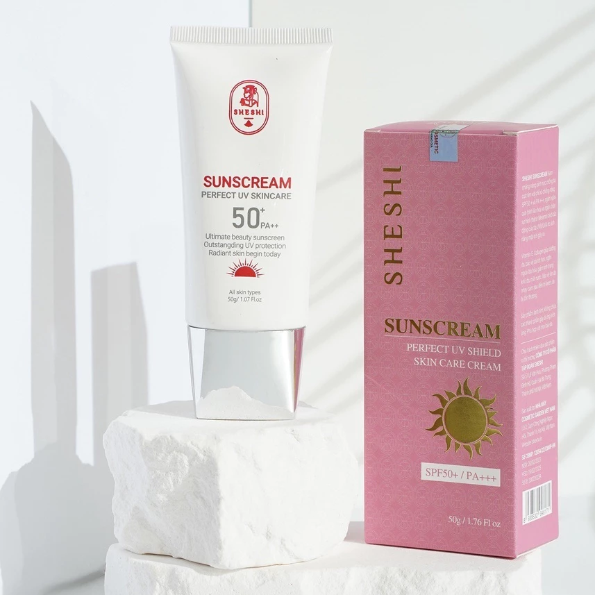 Kem chống nắng Sheshi chứa các thành phần hoạt động như zinc oxide và các chất giữ ẩm, giúp bảo vệ da và dưỡng ẩm trong suốt cả ngày. Với SPF 50+ và PA+++, sản phẩm này cung cấp khả năng bảo vệ cao chống lại cả tia UVA và UVB.