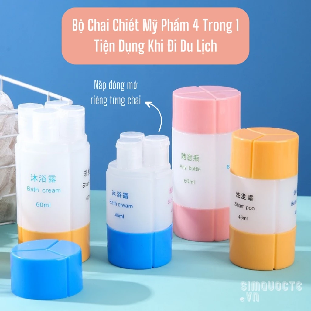 Nếu bạn đang tìm kiếm một bộ chai chiết mỹ phẩm đa năng và tiện lợi, bộ chai chiết mỹ phẩm 4 trong 1 là một lựa chọn tuyệt vời. Sản phẩm này có thể chứa dầu gội, sữa tắm, kem dưỡng và các sản phẩm mỹ phẩm khác.