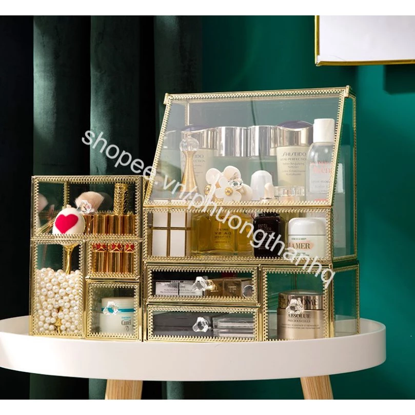 🔥 Kệ đựng mỹ phẩm cao cấp, hộp để đồ trang điểm bằng thuỷ tinh viền ren mạ vàng hàng có sẵn đang giảm giá!
