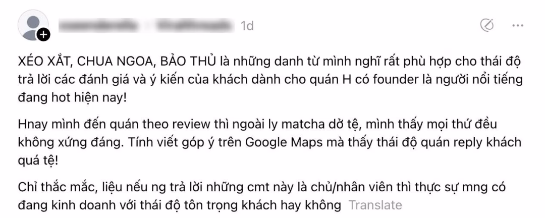 Một số ý kiến còn nhận định các phản hồi có ngôn từ ‘giống như đang móc mỉa khách’, hoặc thể hiện sự đối đầu thay vì lắng nghe góp ý. Điều này đã khiến hình ảnh quán phần nào bị ảnh hưởng trong mắt cộng đồng mạng.