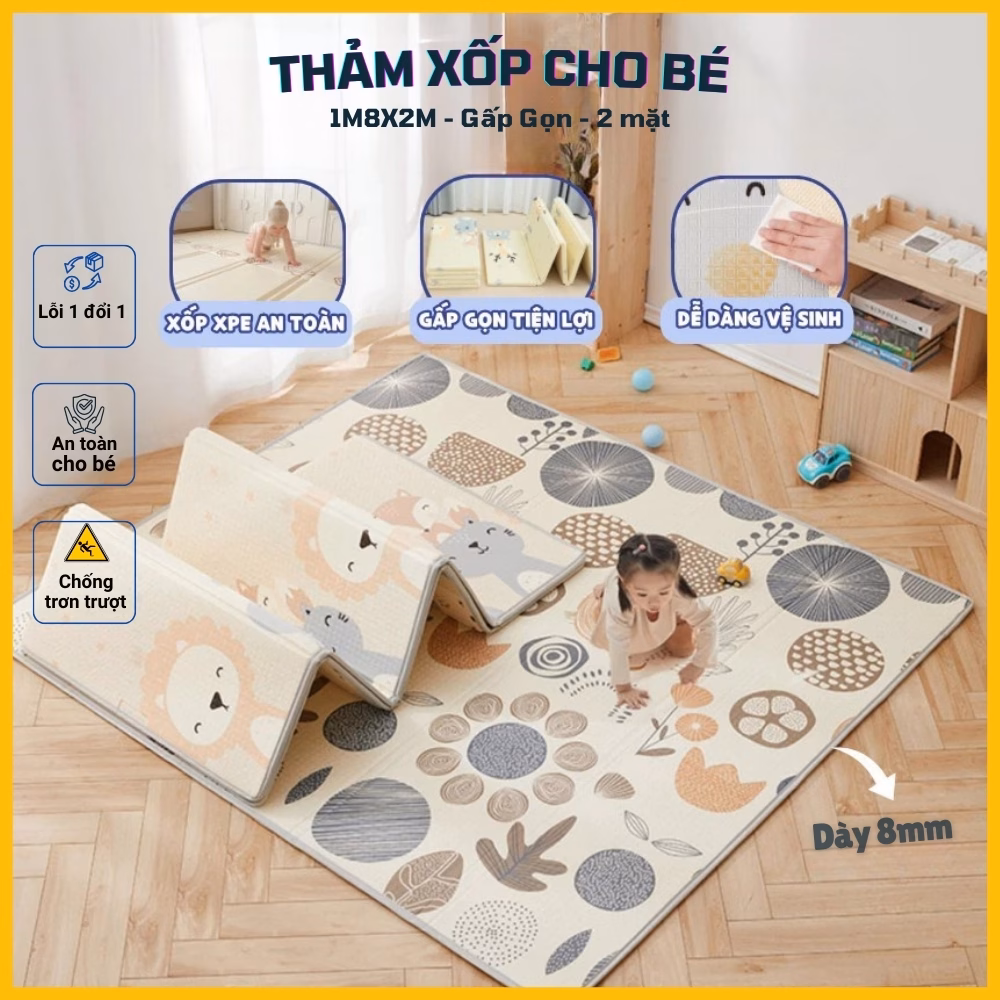 Trên thị trường hiện nay có nhiều loại thảm xốp với thiết kế gấp gọn, tiện lợi cho việc cất trữ và vận chuyển. Một trong những sản phẩm nổi bật là Thảm xốp gấp gọn cho bé loại dày, chiếu xốp trải sàn XPE không thấm nước KT1m8x2m. Sản phẩm này được thiết kế với chất liệu XPE cao cấp, độ dày vượt trội và kích thước rộng rãi, đảm bảo không gian vui chơi thoải mái cho bé.